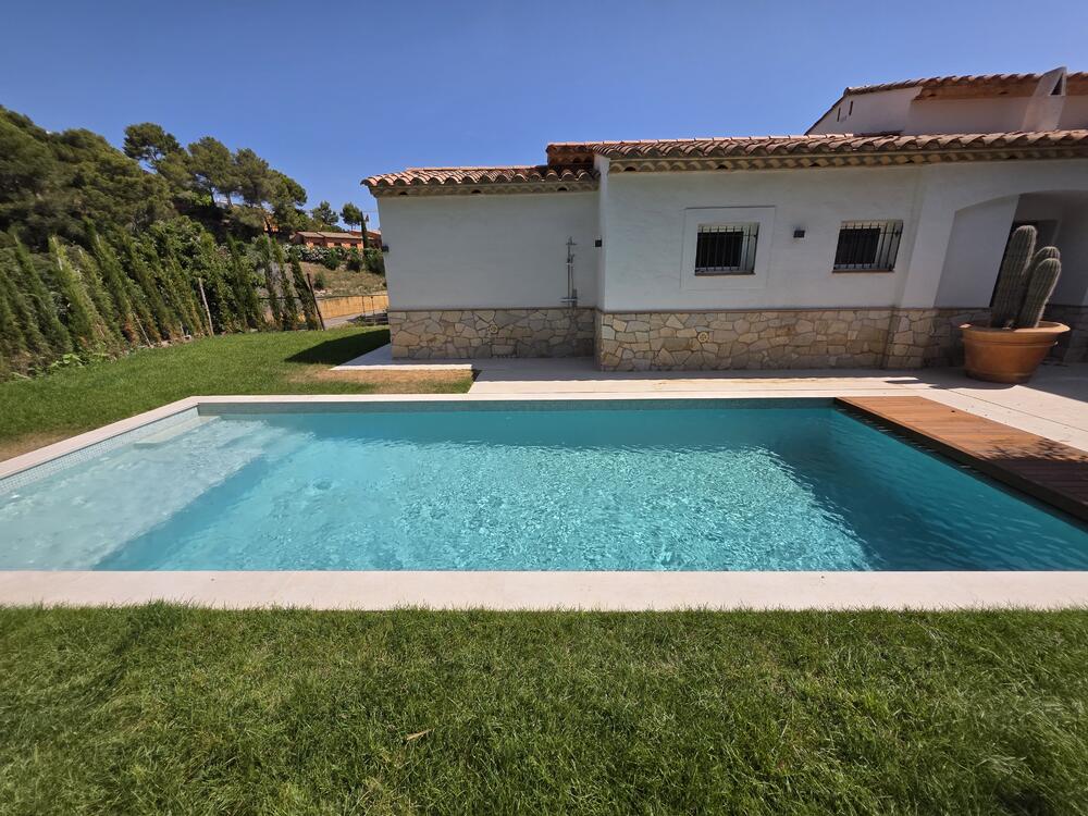 Heerlijke villa met airconditioning, privé zwembad, jacuzzi én zeezicht, plus vier slaapkamers en twee badkamers.De woning, het zwembad en de terrassen zijn allemaal gelijkvloers. Het privé-zwembad en een deel van de tuin liggen aan de achterzijde van het huis, waardoor u over veel privacy beschikt rondom het zwembad. Behalve een zwembad is er aan de andere zijde van het huis ook nog een jacuzzi. Van hieruit kijk je prachtig uit over zee! Bij het zwembad staan ligbedden. Aan de achterkant van het huis is een groot overdekt terras met een loungeset en een stenen barbecue en nog terrassen met allemaal schitterend uitzicht op zee.De woonkamer is ruim en gezellig ingericht. Er is een openhaard en kleurentelevisie. Vanuit de woonkamer kijkt u uit over de omliggende heuvels en de Middellandse zee.De woonkamer heeft een open verbinding naar de keuken. De woning is voorzien van dubbele beglazing en centrale verwarming. De villa heeft twee luxe badkamers, waarvan één ensuite met douche. De ander is voorzien van een ligbad, douche, dubbele wastafel, toilet en bidet. De woning is voorzien van veel ramen, waardoor u naar alle kanten kunt genieten van het uitzicht. De ramen kunnen worden afgeschermd met elektrische rolluiken.De volledig ingerichte keuken heeft als bijzonderheid het hoge aanrecht van 1m. U beschikt o.a. over een ruime koel- en vrieskast, magnetron/grill, elektrische kookplaat, afzuigkap en een vaatwasmachine.De villa heeft vier slaapkamers. Twee slaapkamers hebben een tweepersoonsbed en twee slaapkamers hebben twee 1-persoonsbedden.De woning beschikt boven over een garage. Vanuit de garage komt u met een trap naar beneden direct in de woning. De woning beschikt tevens over wasmachine en droger.