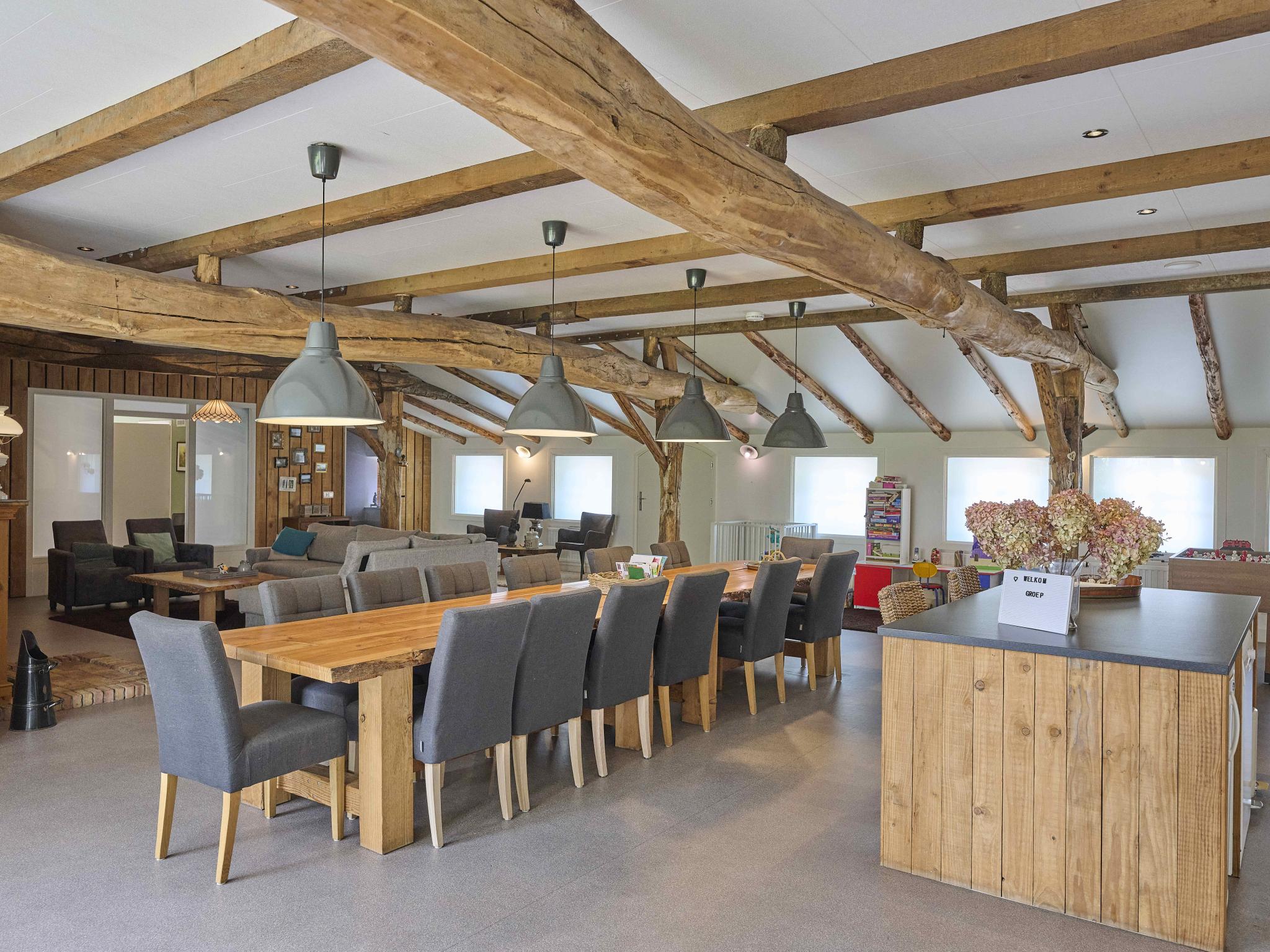 Begane grond: (open keuken(waterkoker, broodrooster, fornuis(gas), afzuigkap, koffiezetapparaat(pads), koffiezetapparaat(filtermaling), oven, combimagnetron, afwasmachine, koel-/vriescombinatie, Blender), woon/eetkamer(TV(flatscreen, smart TV), eettafel, sfeerhaard, zithoek), slaapkamer(2x 1-pers. bed(boxspring)), slaapkamer(2-pers. bed, wastafel), slaapkamer(2x 1-pers. bed(boxspring), kinderbox), badkamer(douche, wastafel, wc), badkamer(douche, 2x wastafel), badkamer(douche), toilet(wc, urinoir), relaxruimte(TV, zithoek))