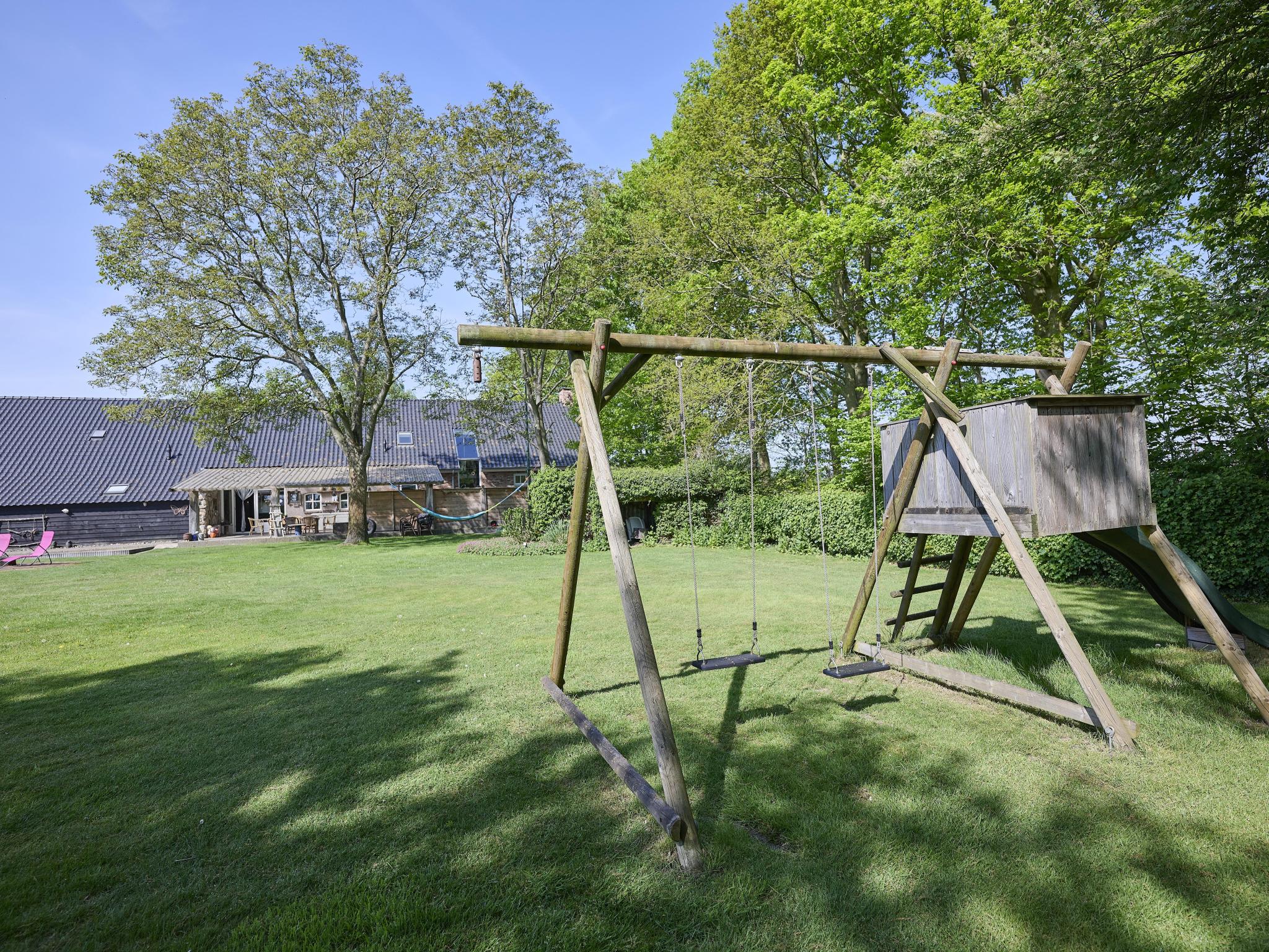 terras(privé, overdekt), tuin(privé), tuinmeubilair, 6x parking, trampoline, ligstoelen, jeu de boules baan, speeltoestellen, glijbaan, voetbalgoal, hangmat, 1x kinderbed (excl. beddengoed), 1x kinderstoel, kinderbox, gezelschapsspellen, speelgoed, Schommel