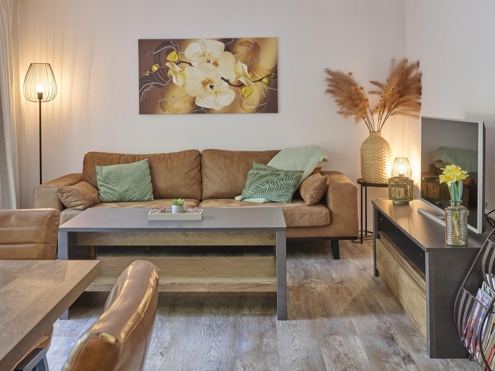 Begane grond: (open keuken(kookplaat(gas), waterkoker, afzuigkap, koffiezetapparaat(filtermaling), koffiezetapparaat(cups), oven(elektrisch), afwasmachine, koel-/vriescombinatie), woon/eetkamer(TV(flatscreen, smart TV), eettafel(6 personen), zithoek), slaapkamer(2-pers. bed), badkamer(douche(inloopdouche), wastafel, verwarming(CV)), toilet(wastafel, wc))