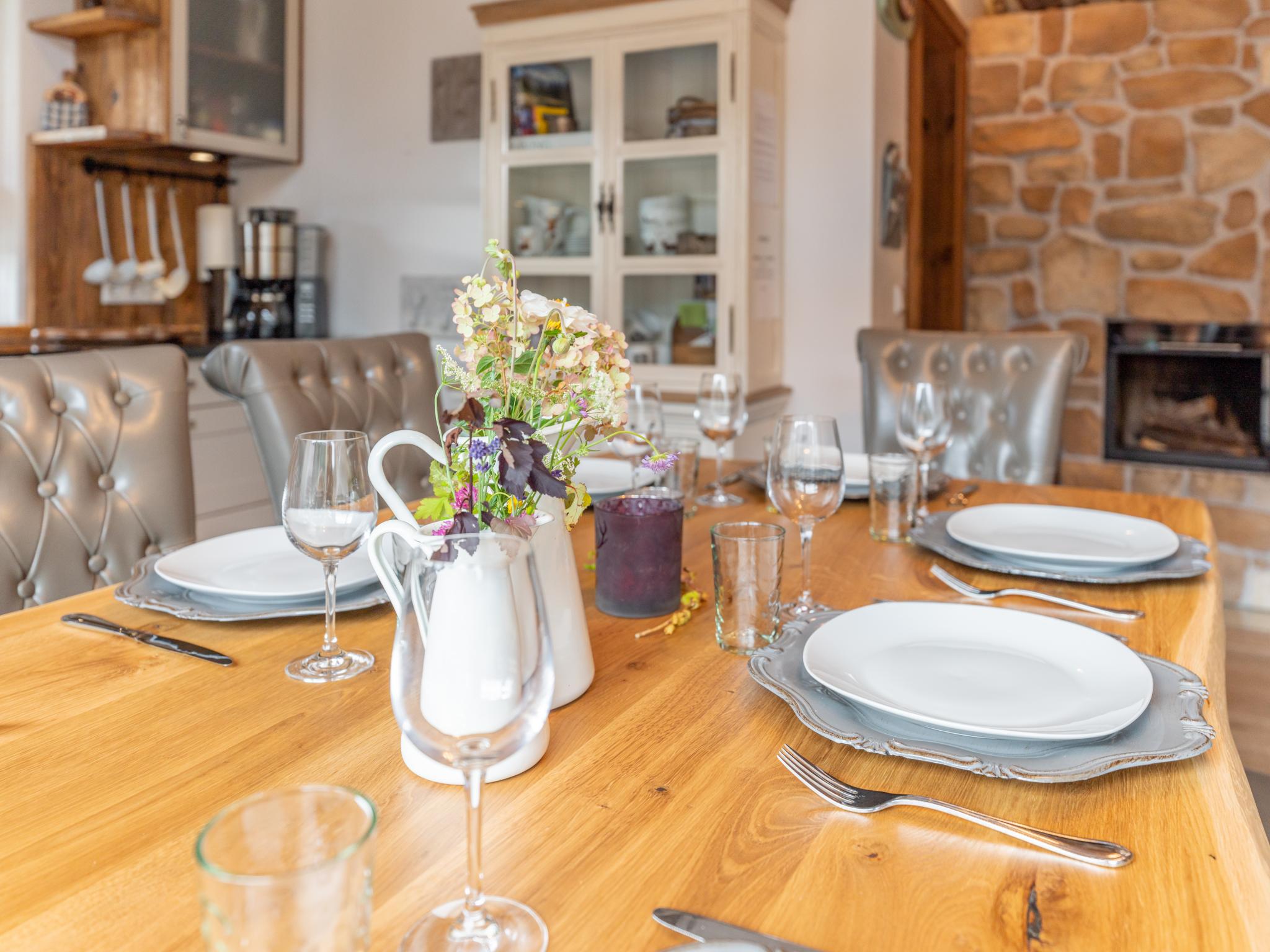 Op de 1e etage: (keuken(waterkoker, broodrooster, koffiezetapparaat(filtermaling), oven, afwasmachine, koel-/vriescombinatie), woon/eetkamer(TV(flatscreen), eettafel, open haard, zithoek), slaapkamer met badkamer(2-pers. bed, 2-pers. hoogslaper, douche, wastafel, wc), balkon)