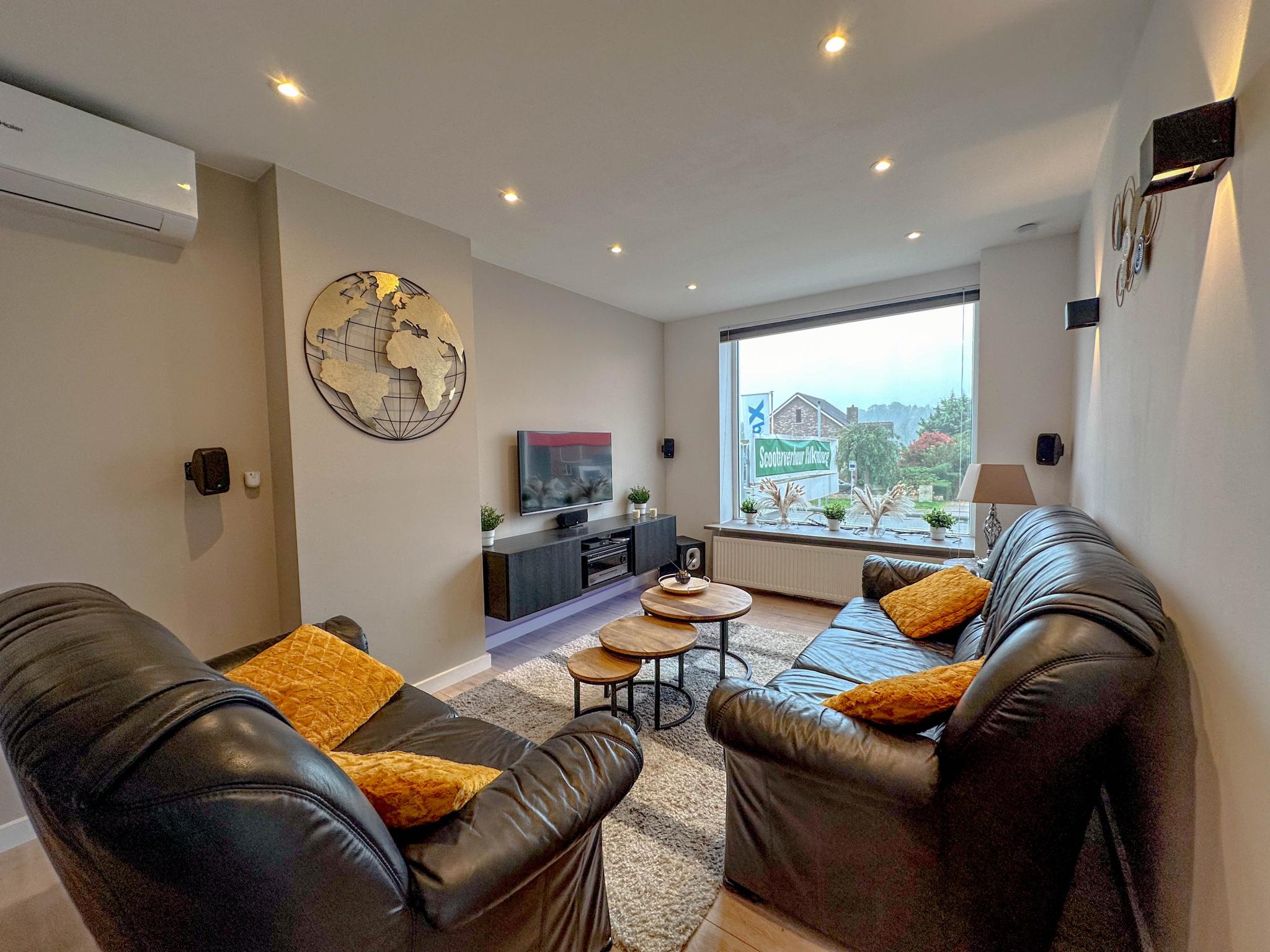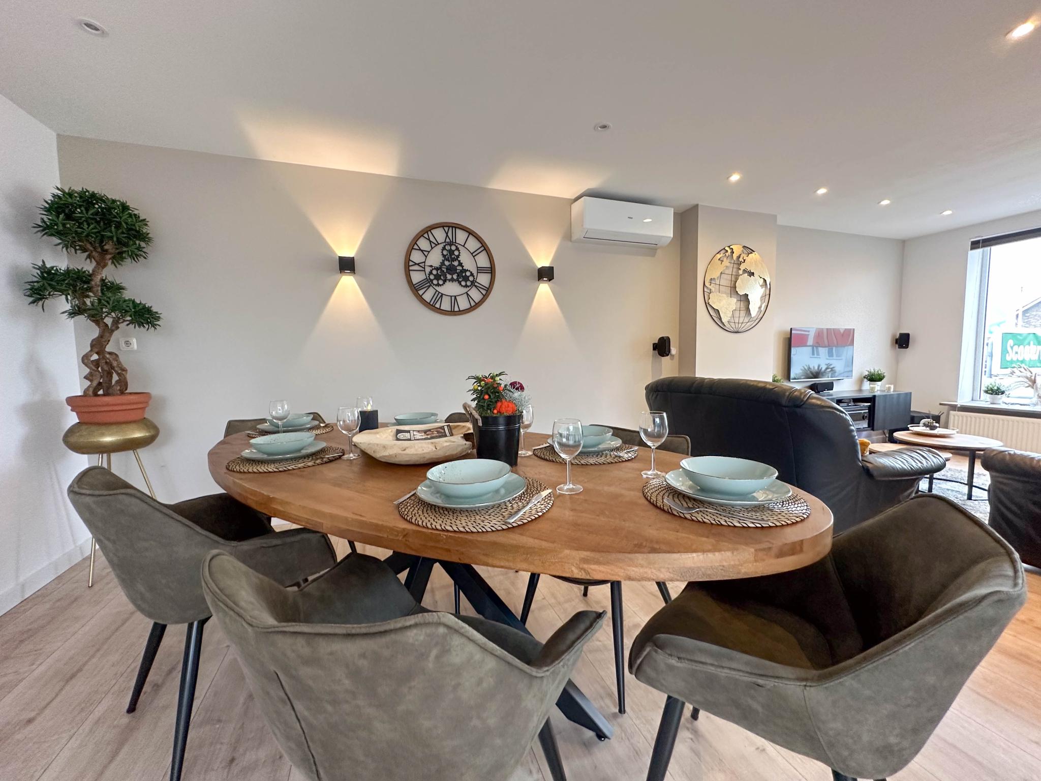 Op de 1e etage: (hal, keuken(waterkoker, fornuis, afzuigkap, koffiezetapparaat(filtermaling, pads), afwasmachine, koelkast, vriezer), woon/eetkamer(TV, eettafel, sfeerhaard, zithoek, airconditioning), toilet(wc), bijkeuken(wasmachine))