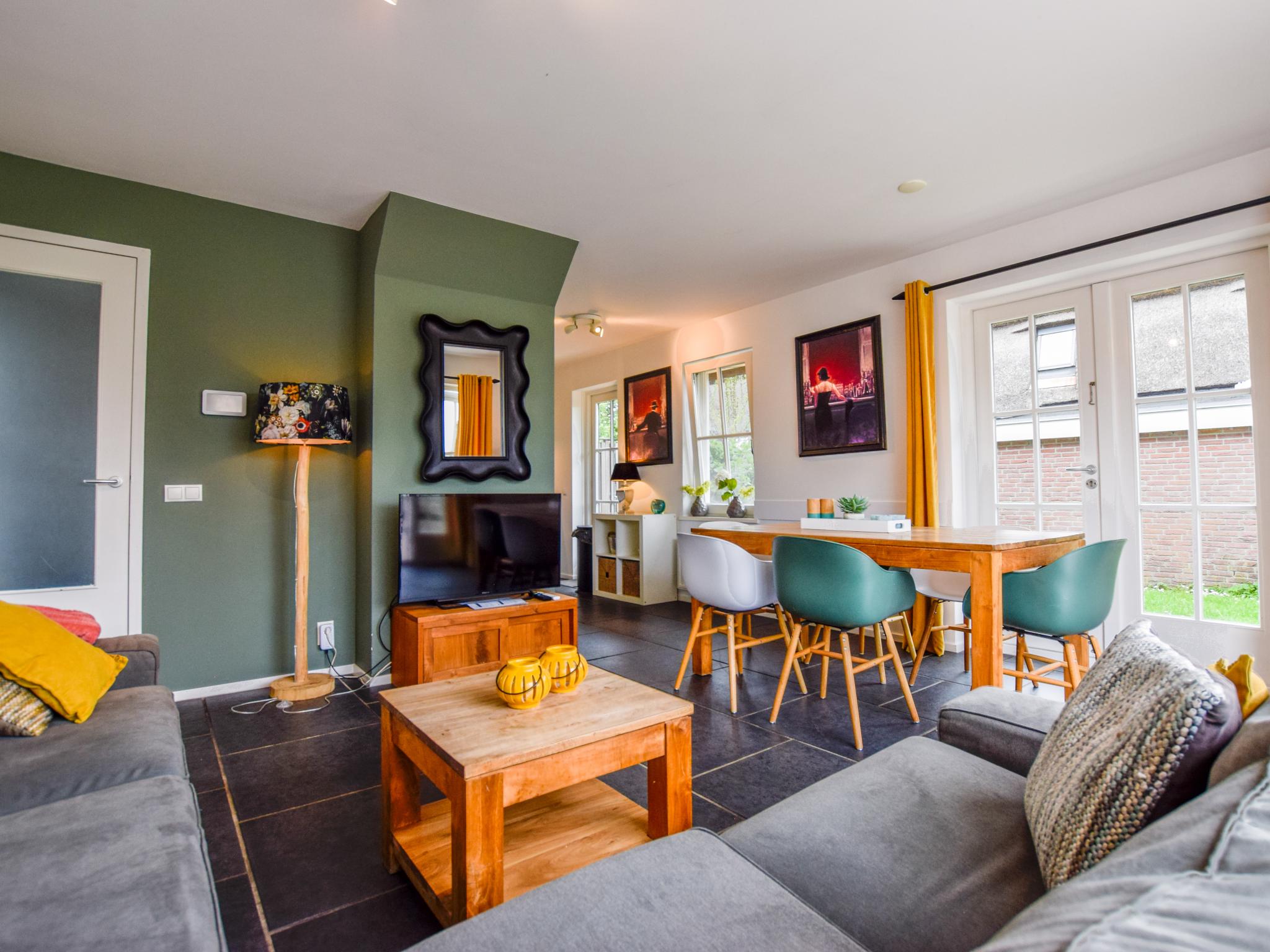 Begane grond: (woonkamer(TV(kabel, flatscreen, digital, Nederlandse zender(s), Duitse zender(s), internationale zender(s)), eettafel, zithoek), open keuken(kookplaat(4 kookplaten, gas), waterkoker, afzuigkap, koffiezetapparaat(cups), koffiezetapparaat(filtermaling), oven, combimagnetron, afwasmachine, koel-/vriescombinatie), toilet(wastafel), wasruimte(wasdroger, wasmachine), terras(privé, omheind))